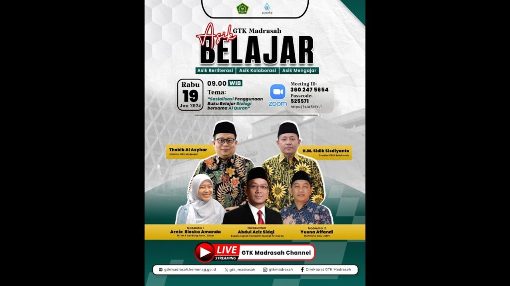 Dalam rangka meningkatkan kompetensi Guru madrasah menerapkan pembelajaran Sains terintegrasi dengan Al-Quran, Direktorat GTK Madrasah dan Direktorat KSKK Madrasah Ditjen Pendidikan Islam berkolaborasi dengan Lajnah Pentashih Mushaf Al-Quran mengundang Anda dalam Webinar Asik Belajar, dengan tema: Sosialisasi Penggunaan Buku Belajar Biologi bersama Al-Quran .